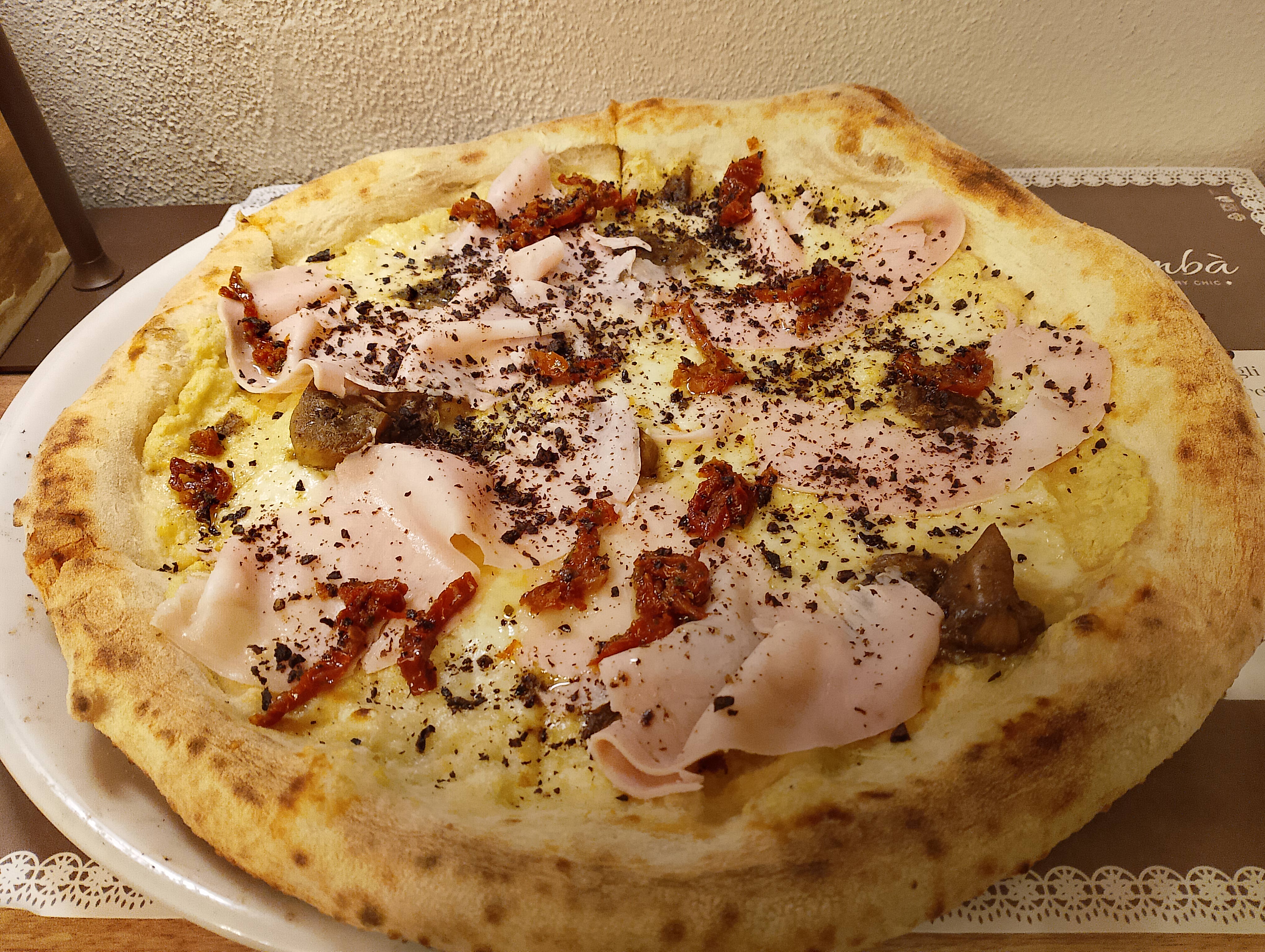 Lokaler Fiordilatte-Mozzarella, leckerer knuspriger Speck, in Julienne geschnittene frische Zucchini und gelbe Datterino-Tomaten aus Rosso Gargano, ein Spritzer natives Olivenöl extra, gehobelter Parmesan und frische Basilikumblätter.