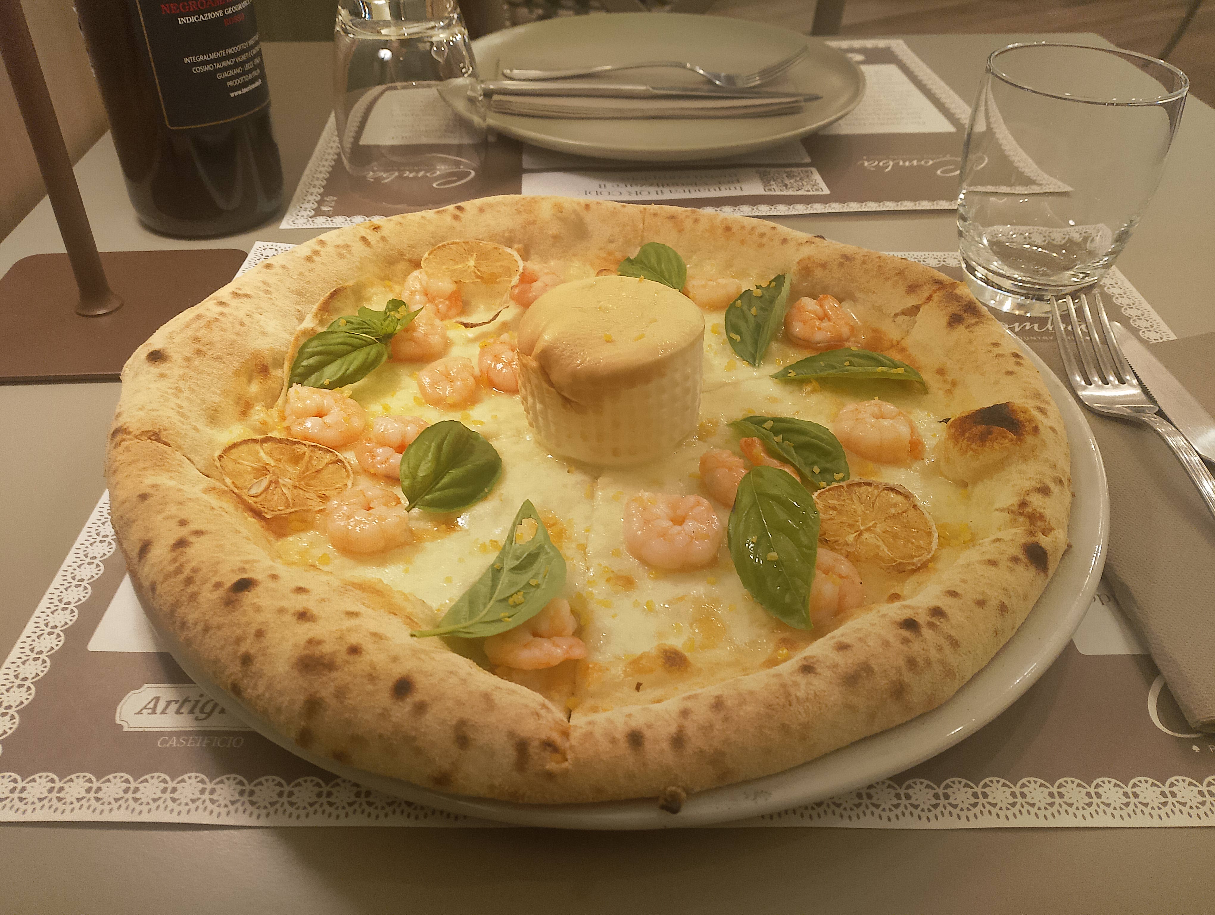 Eine großzügige Portion Mozzarella Fiordilatte, eine ganze geräucherte Burrata aus der Molkerei Artigiana, frische Basilikumblätter und Garnelen, beträufelt mit nativem Olivenöl extra und geriebener Zitronenschale.