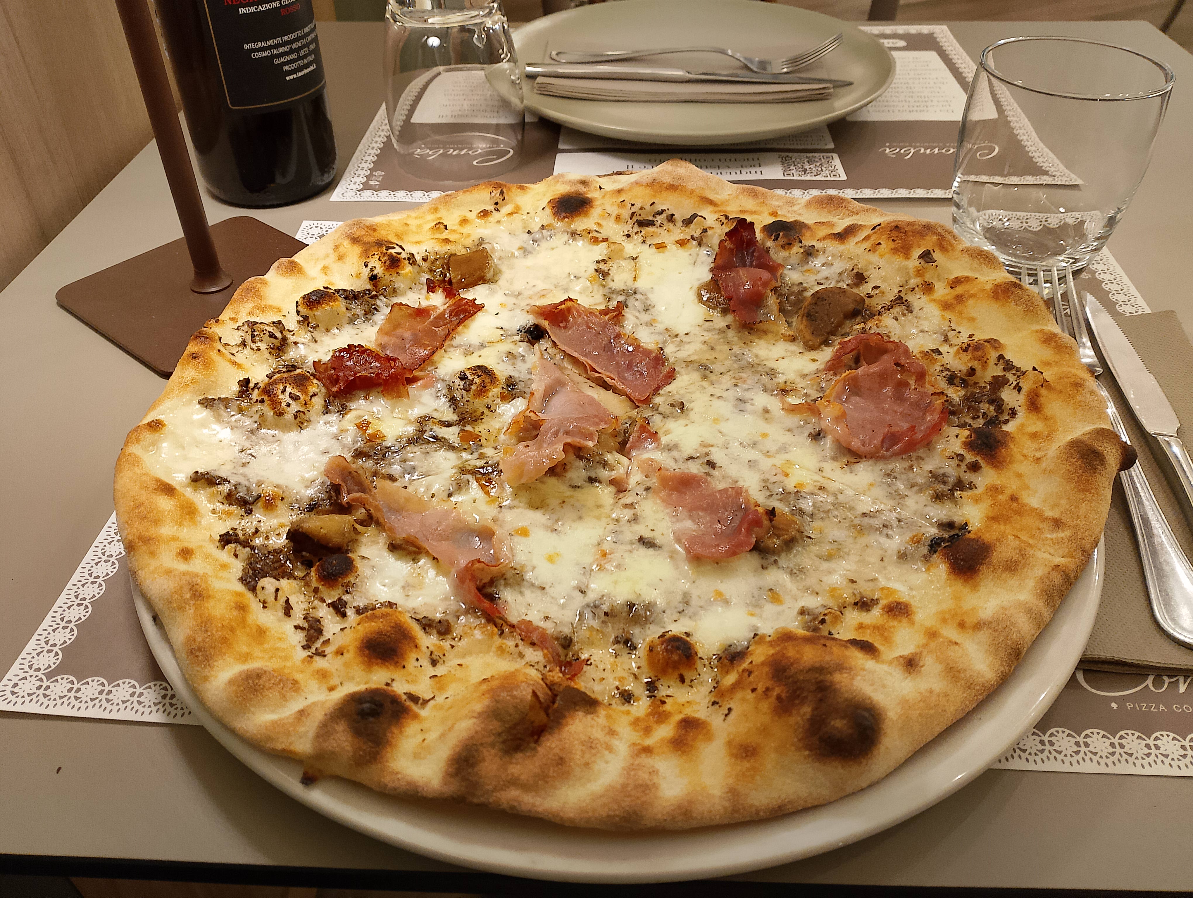 Trüffelcreme mit einer Mischung aus Fiordilatte-Mozzarella und geräuchertem Scamorza aus der Molkerei Artigiana, knusprigem Speck und sautierten Steinpilzen mit Rosmaringeschmack.