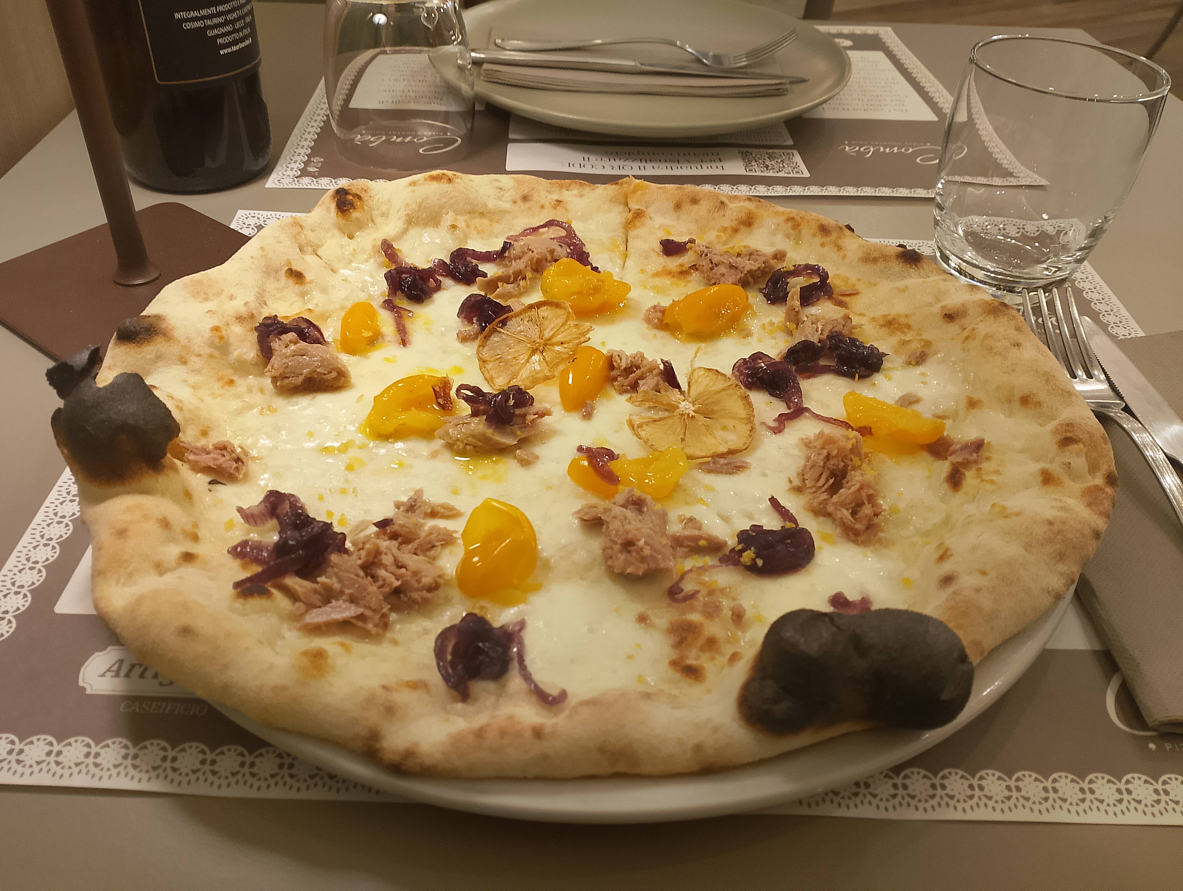 Fiordilatte mozzarella and Rosso Gargano yellow datterino tomatoes, served with tuna in oil, caramelized onion, and grated lemon zest