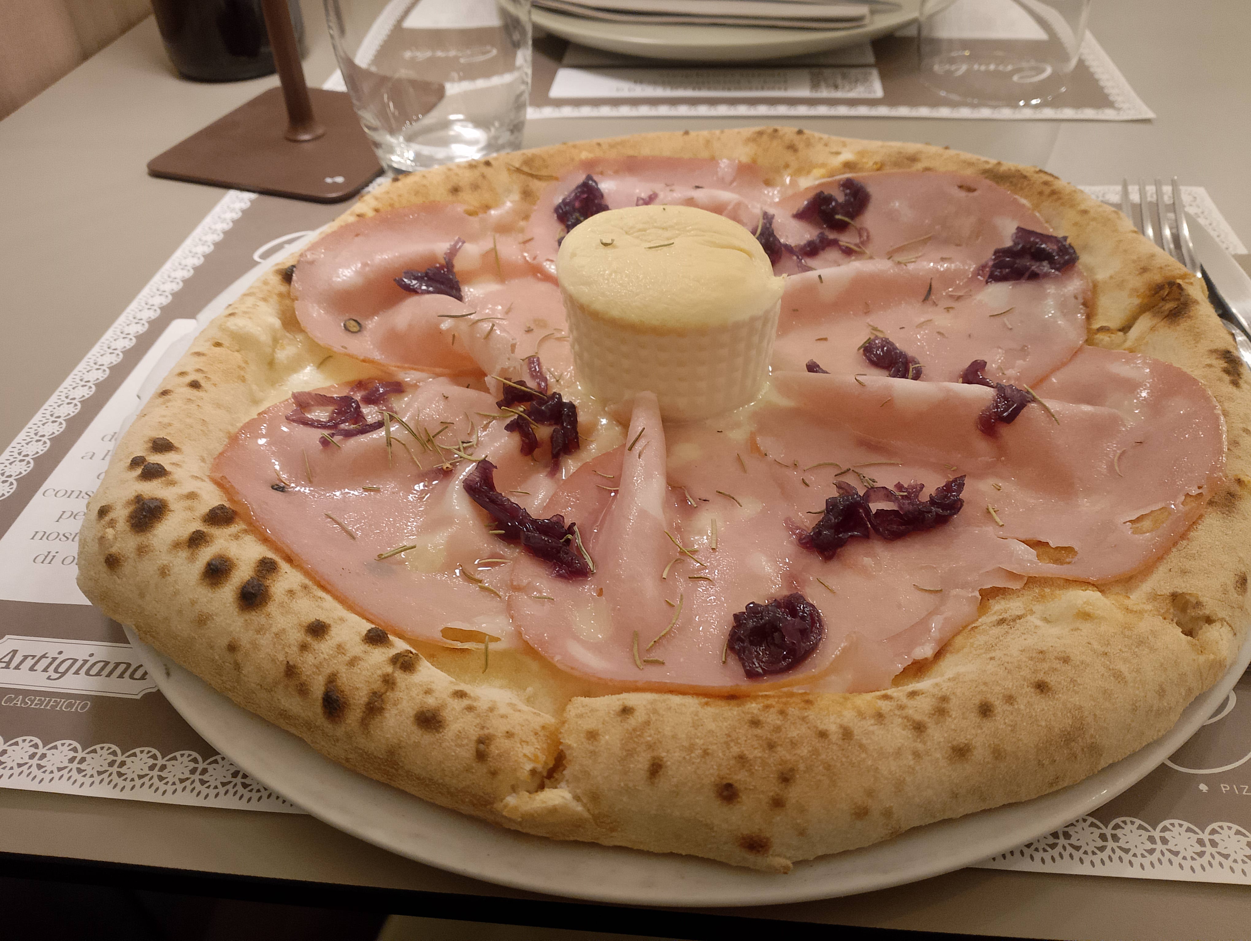 🥒Crema di zucchina con mozzarella fior di latte di Putignano, in uscita prosciutto cotto scelto, fiocchi di formaggio fresco, cipolla rossa caramellata fatta in casa e foglie di basilico fresco.