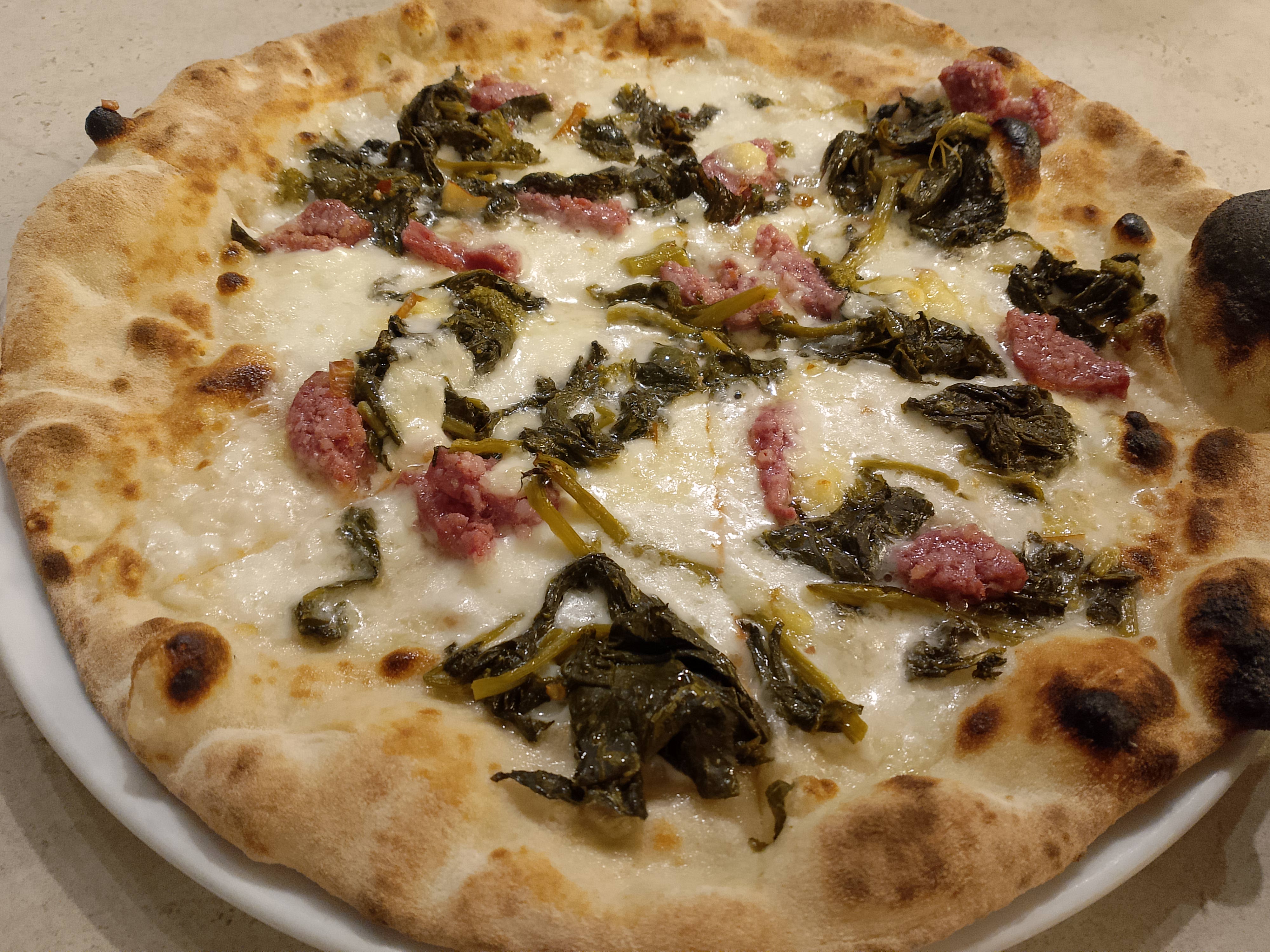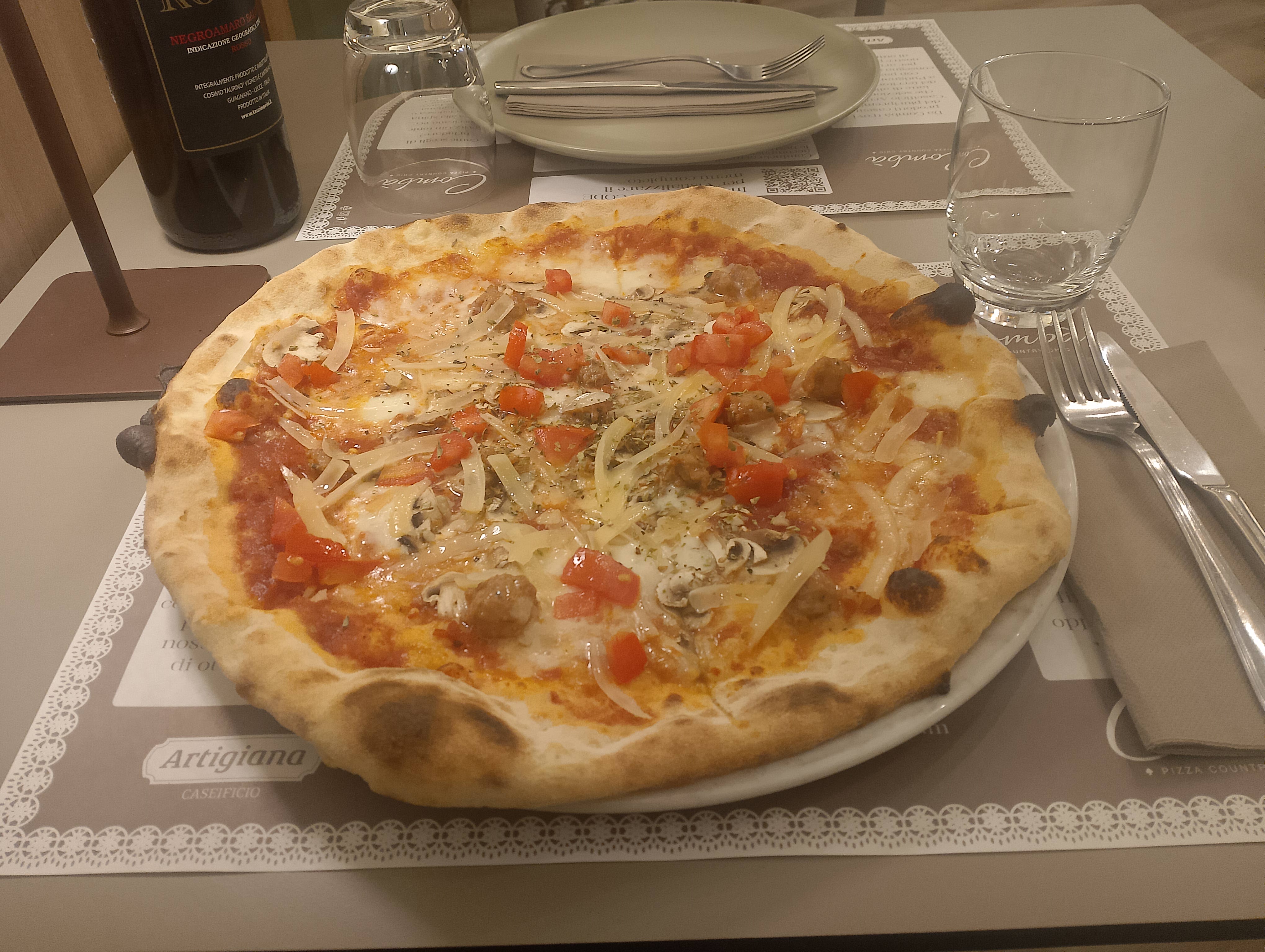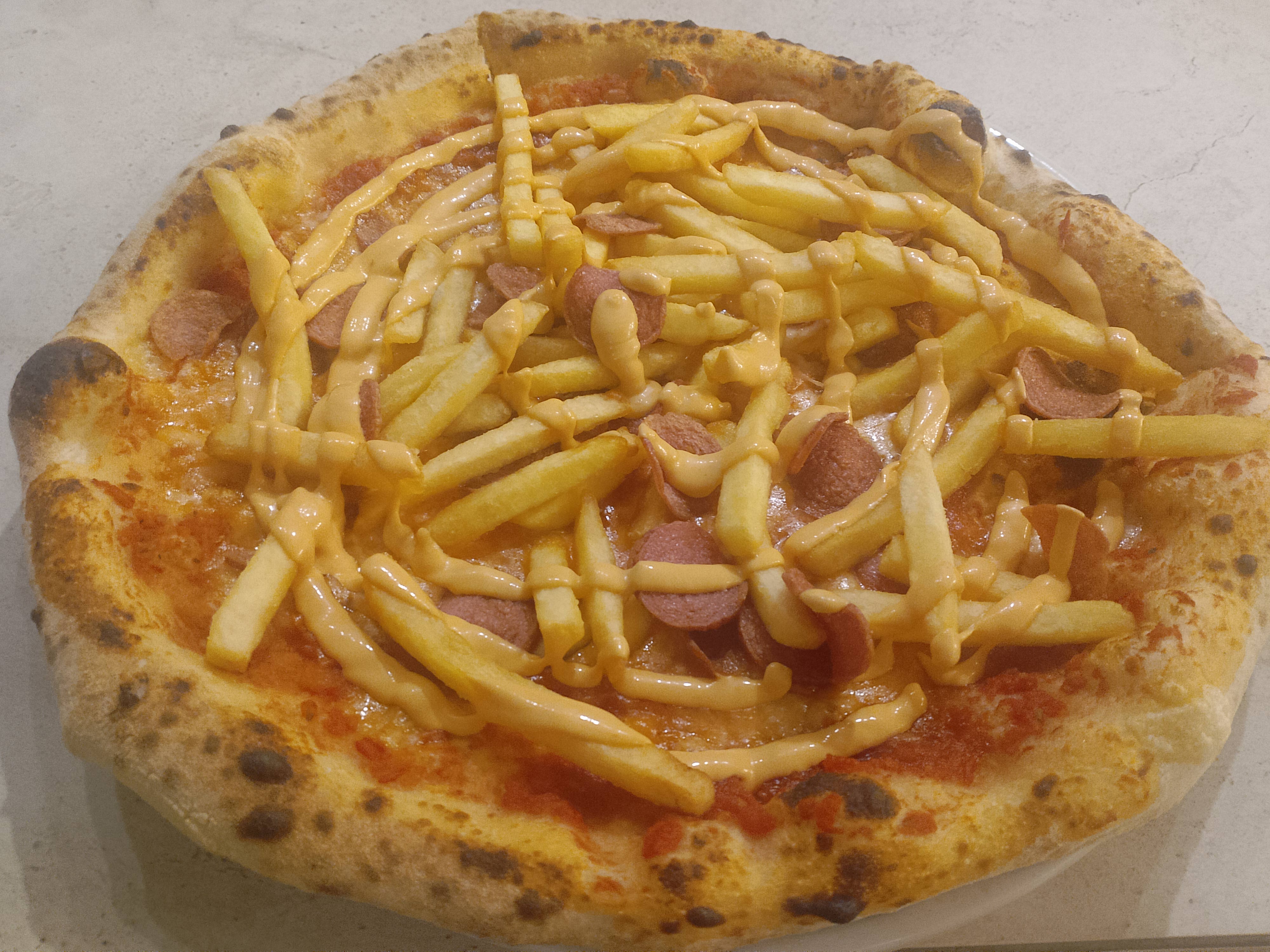 Italienisches Tomatenpüree und lokaler Fiordilatte-Mozzarella, gekocht mit knusprigem, würzigem Speck und roten Zwiebelstreifen, abgerundet mit Parmesanspänen und frisch gemahlenem schwarzen Pfeffer nach Geschmack.