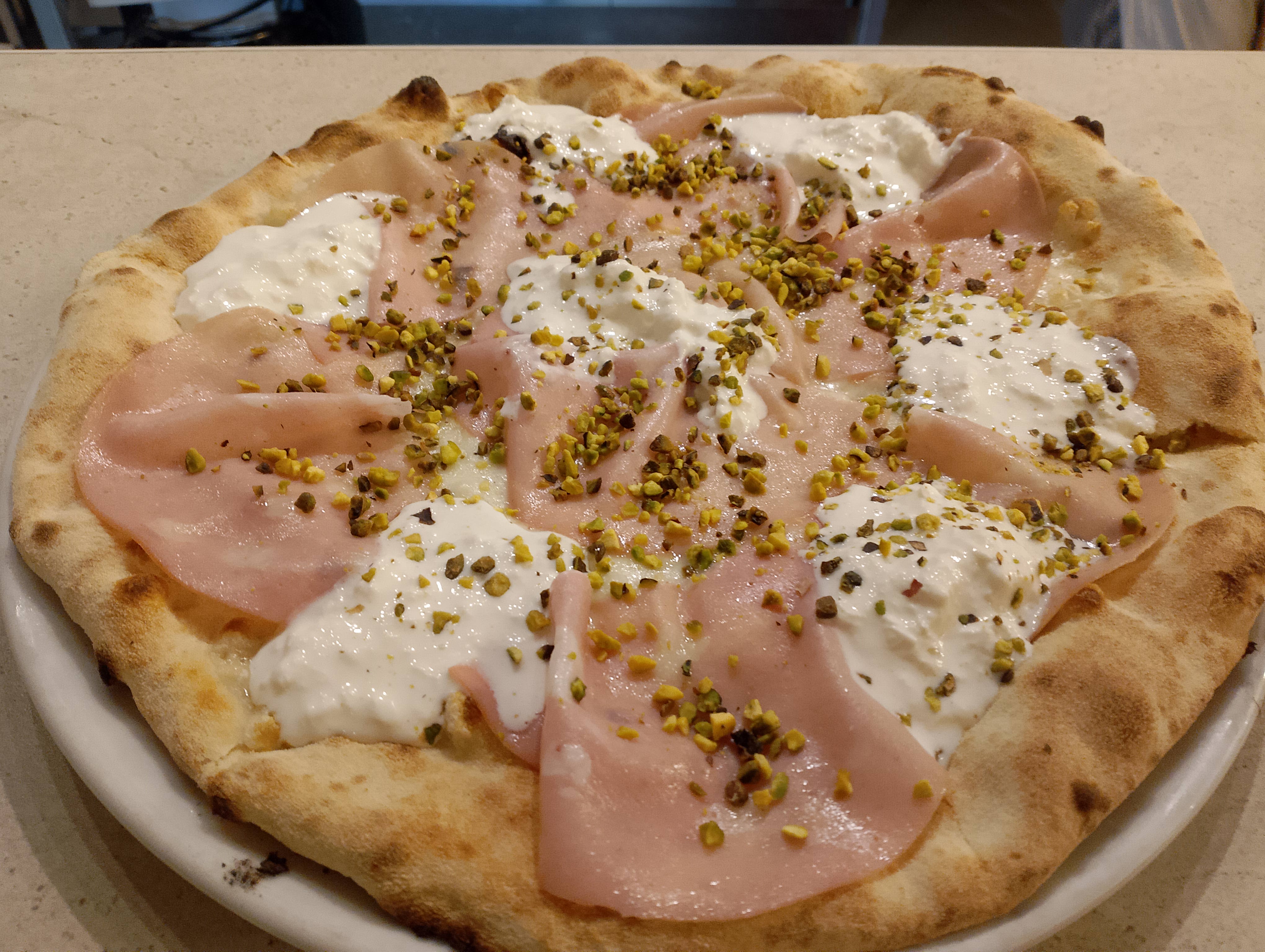 Fiordilatte-Mozzarella, Mortadella g.g.A., lokale Stracciatella und knusprige Pistazienkrümel mit einem Schuss extra nativem Olivenöl.