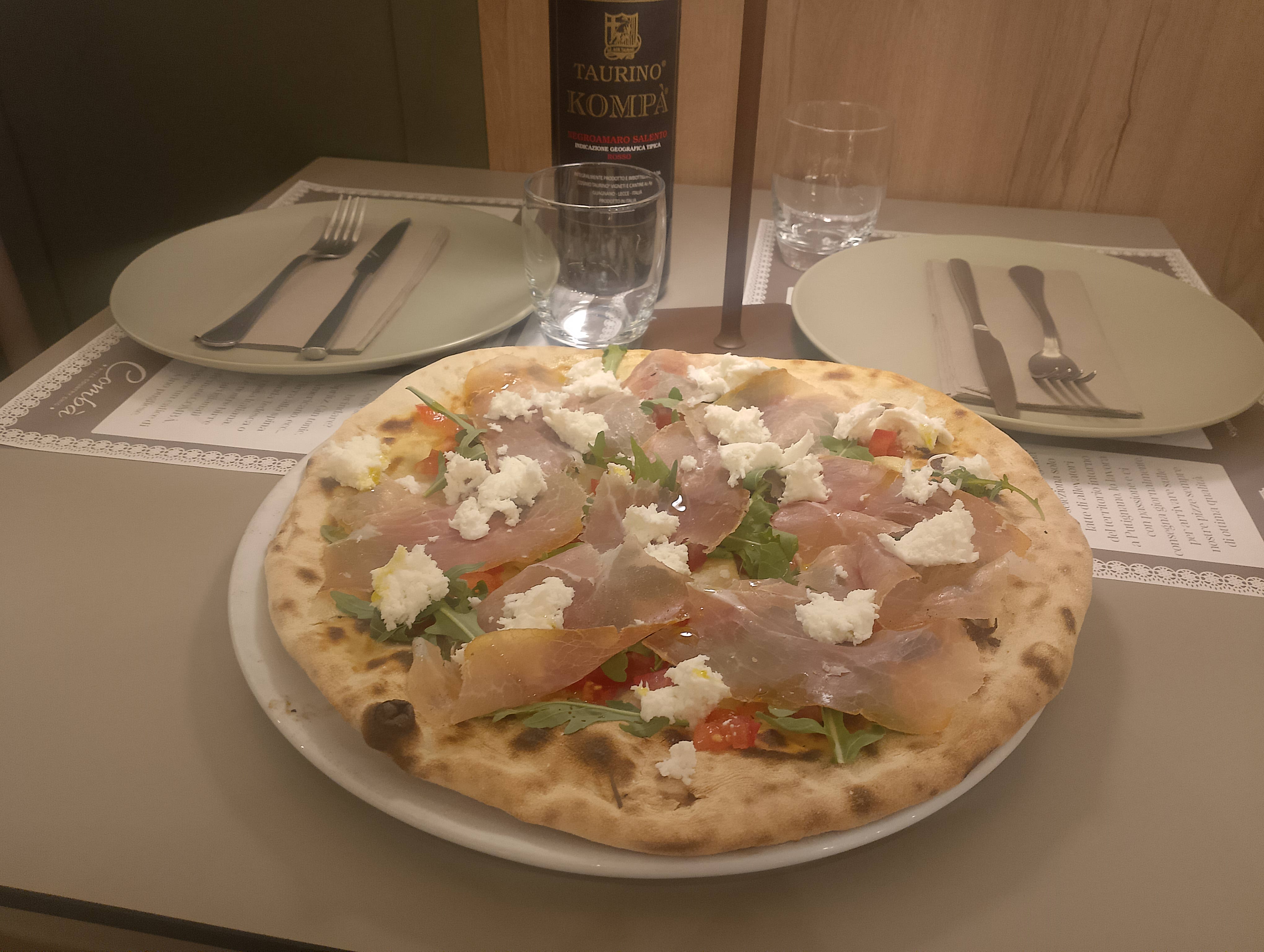 Gebackener Teig, gewürzt mit nativem Olivenöl extra, Salz, Oregano und Rosmarin. Belag: frische Rucolablätter, Concassé-Tomaten, Prosciutto-Schinkenblätter und handgeriebene Fiordilatte-Mozzarella.