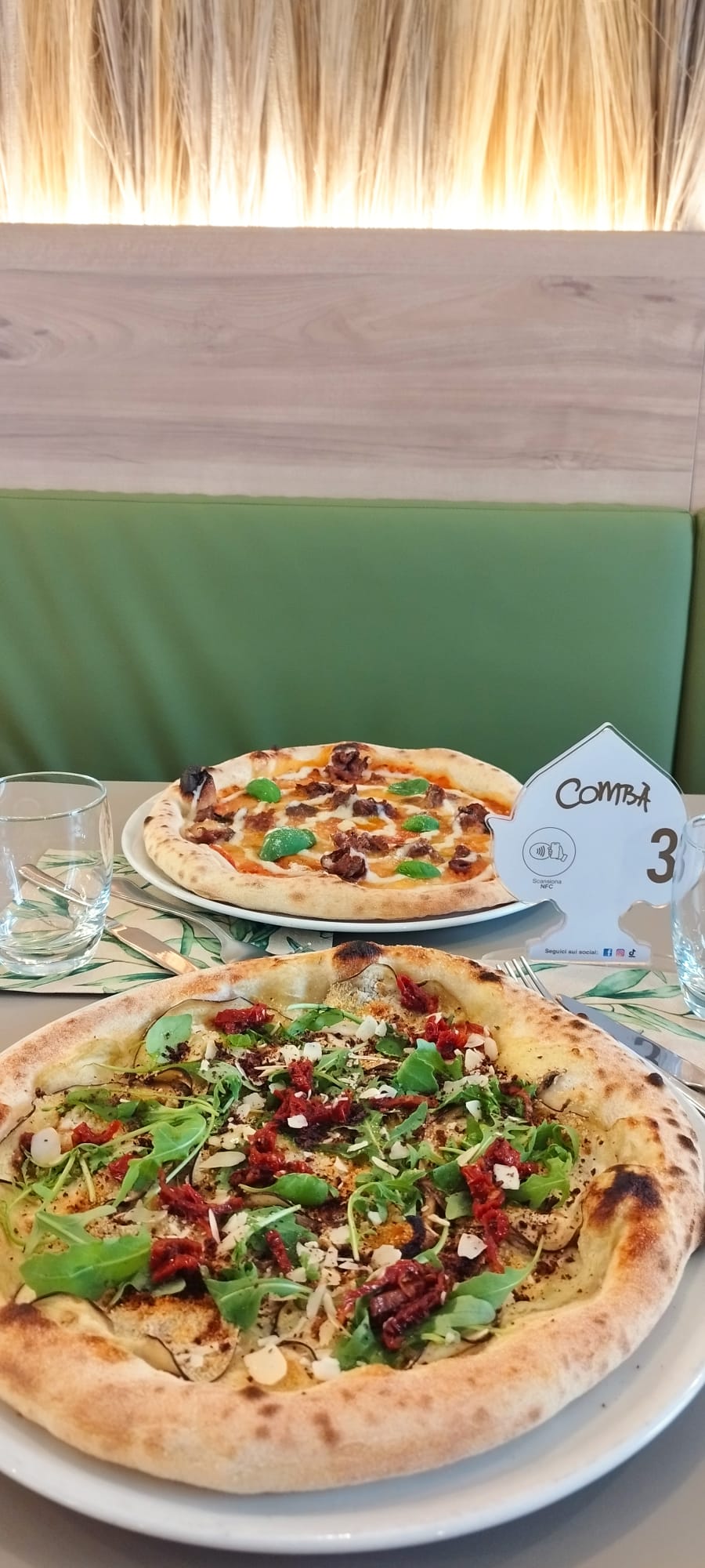 Baked dough seasoned with extra virgin olive oil, salt, oregano and rosemary, topped with fresh arugula leaves, concassé red tomato