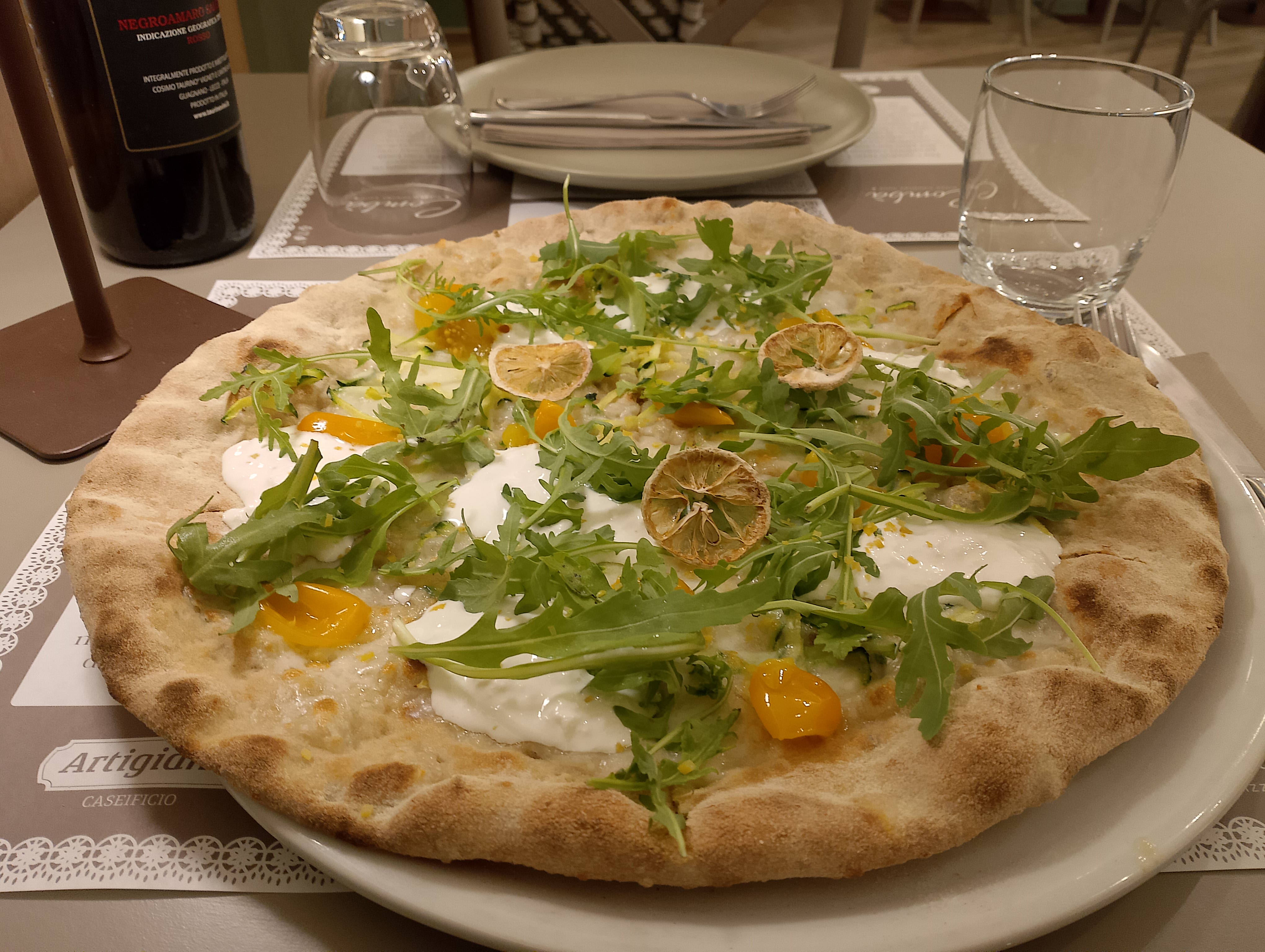 Fiordilatte mozzarella, Rosso Gargano yellow datterino tomatoes, and julienned zucchini, served with fresh rocket leaves, local stracciatella, and grated lemon zest.