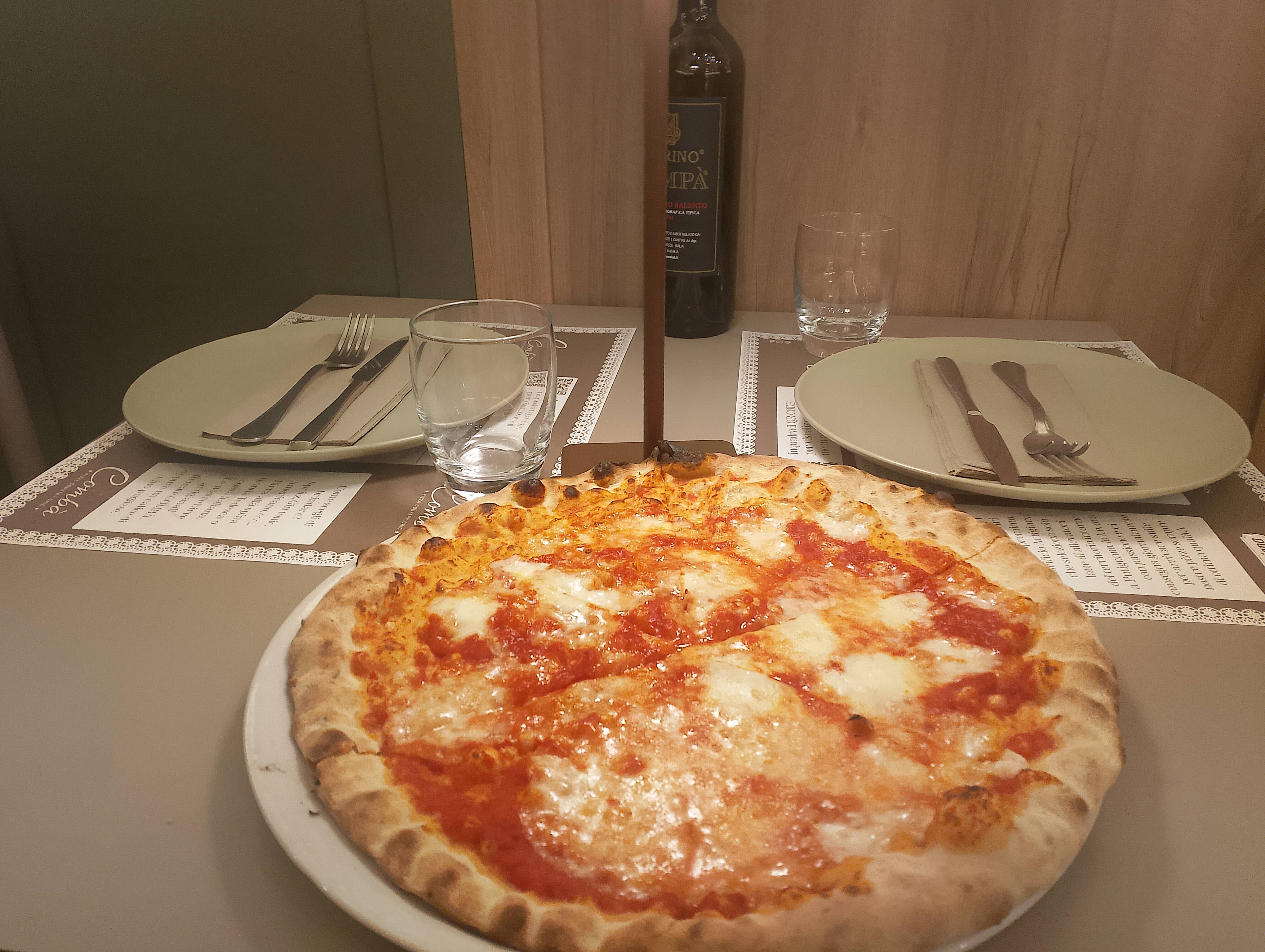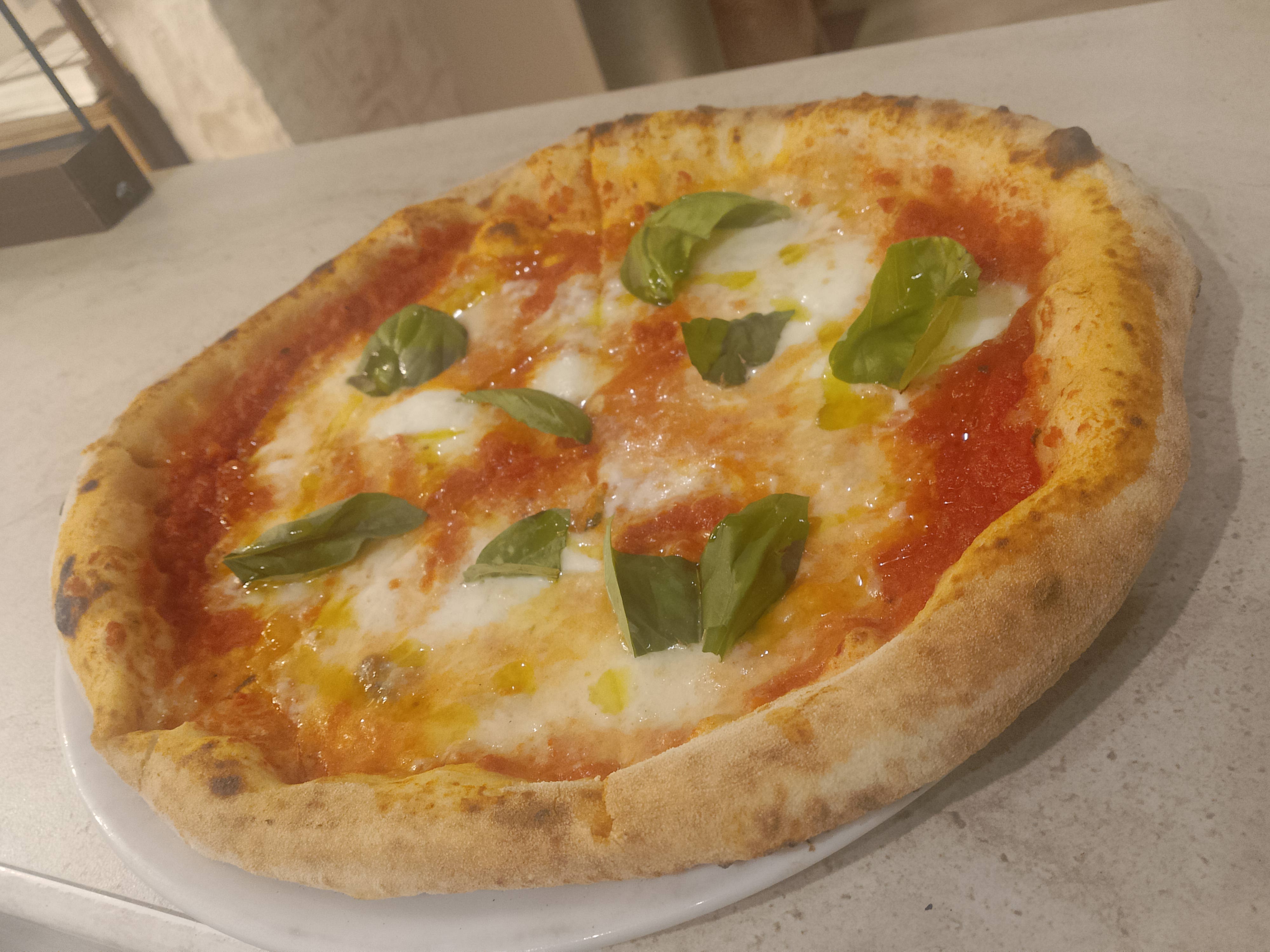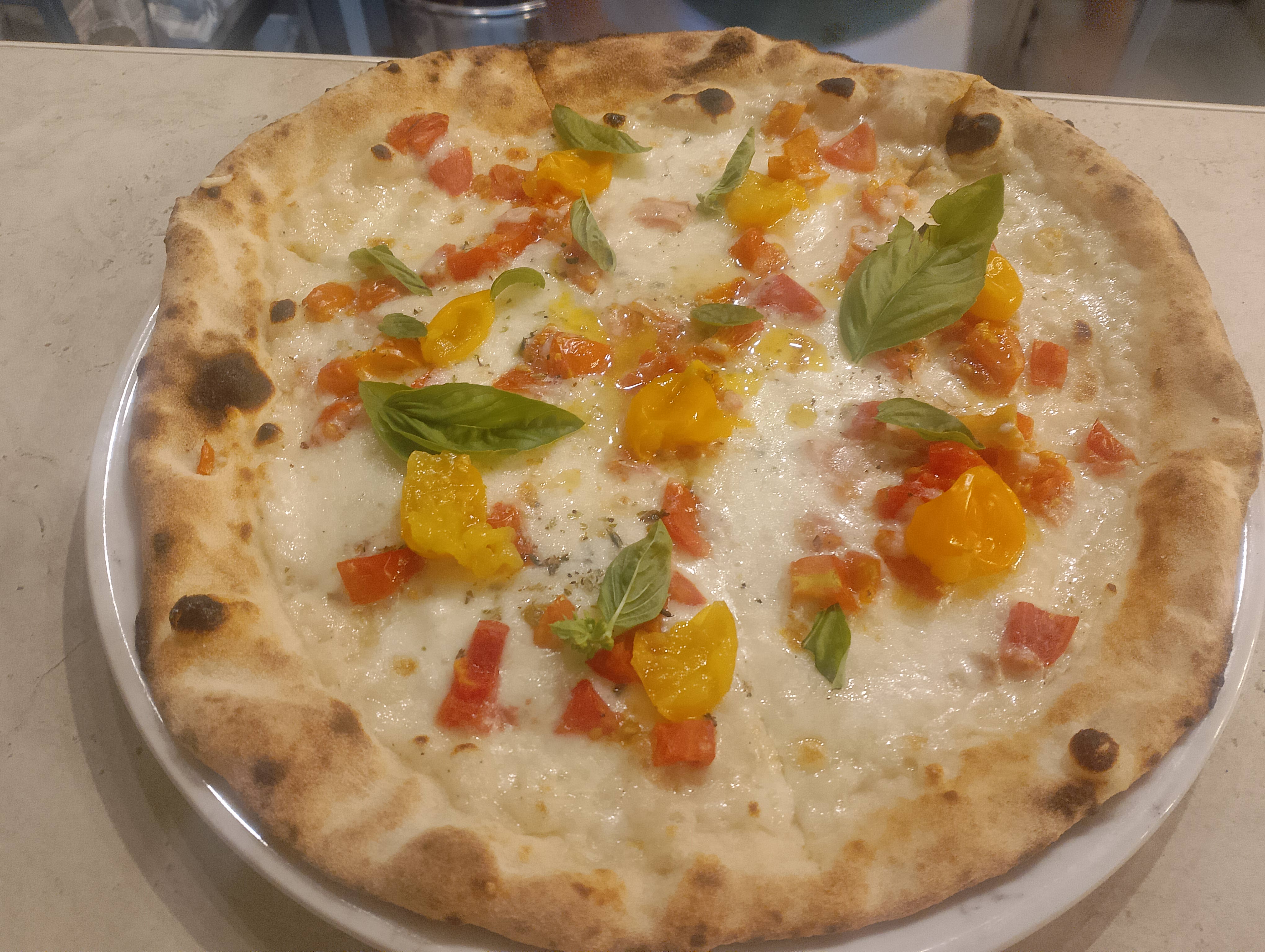 Baked Italian tomato puree, raw hand-shredded DOP buffalo mozzarella from Campania, Rosso Gargano yellow datterino tomatoes, fresh basil leaves, dried oregano, and extra virgin olive oil.