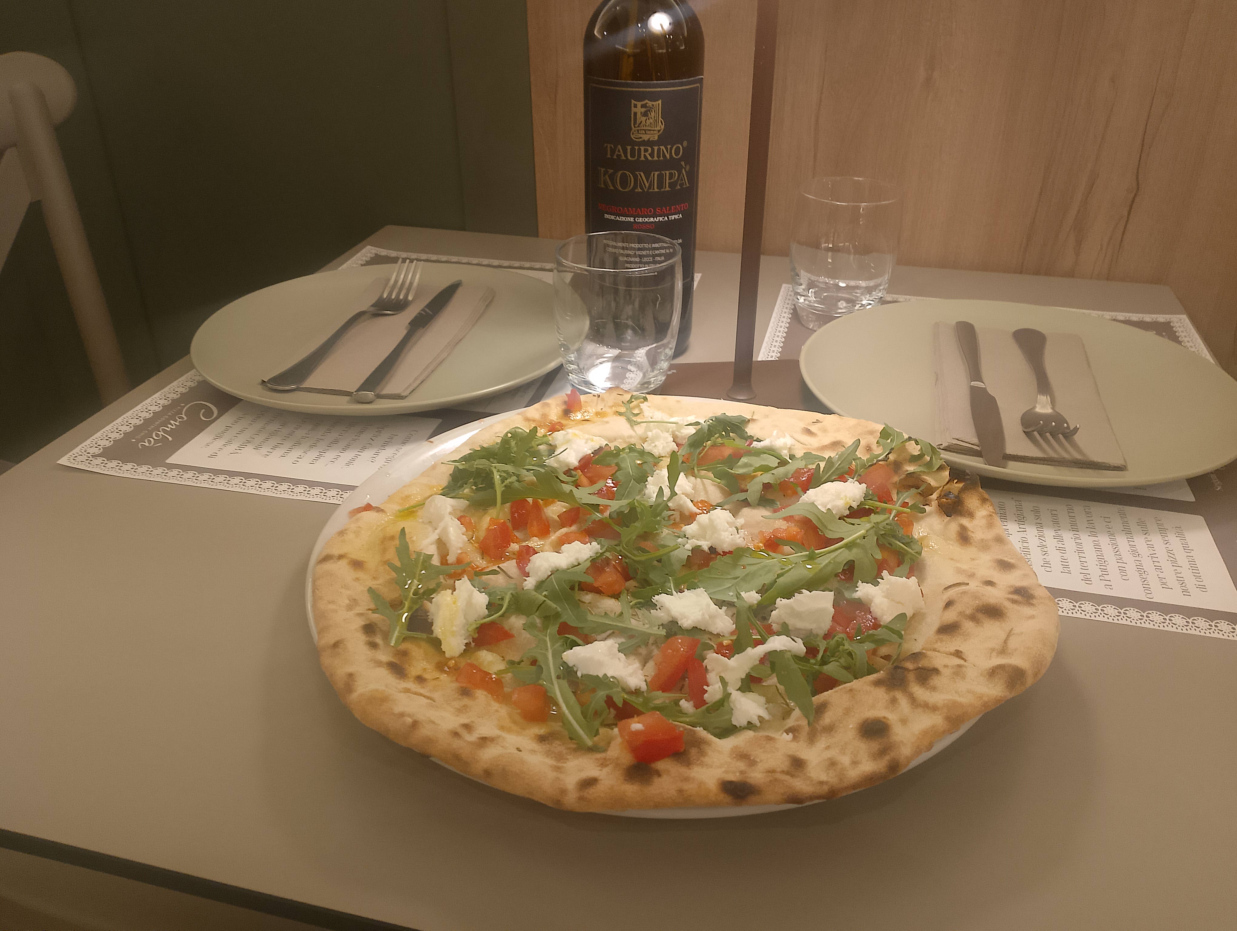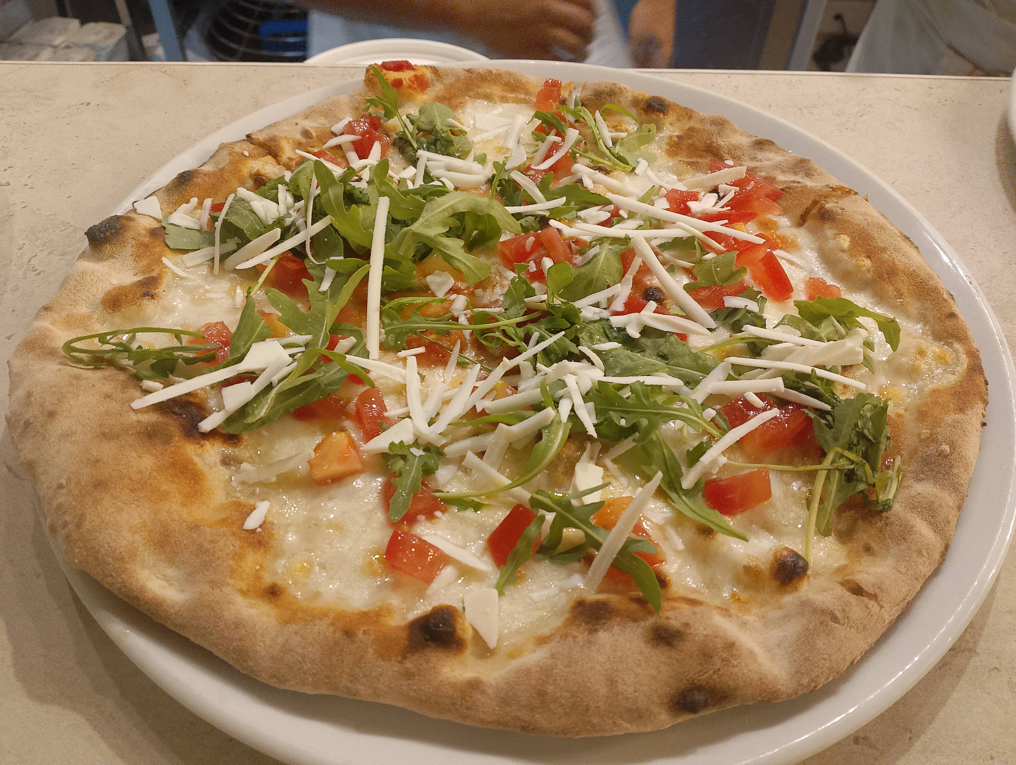 Fiordilatte mozzarella, concassé red copper tomato, fresh rocket leaves, shavings of local cacioricotta, and a drizzle of extra virgin olive oil.