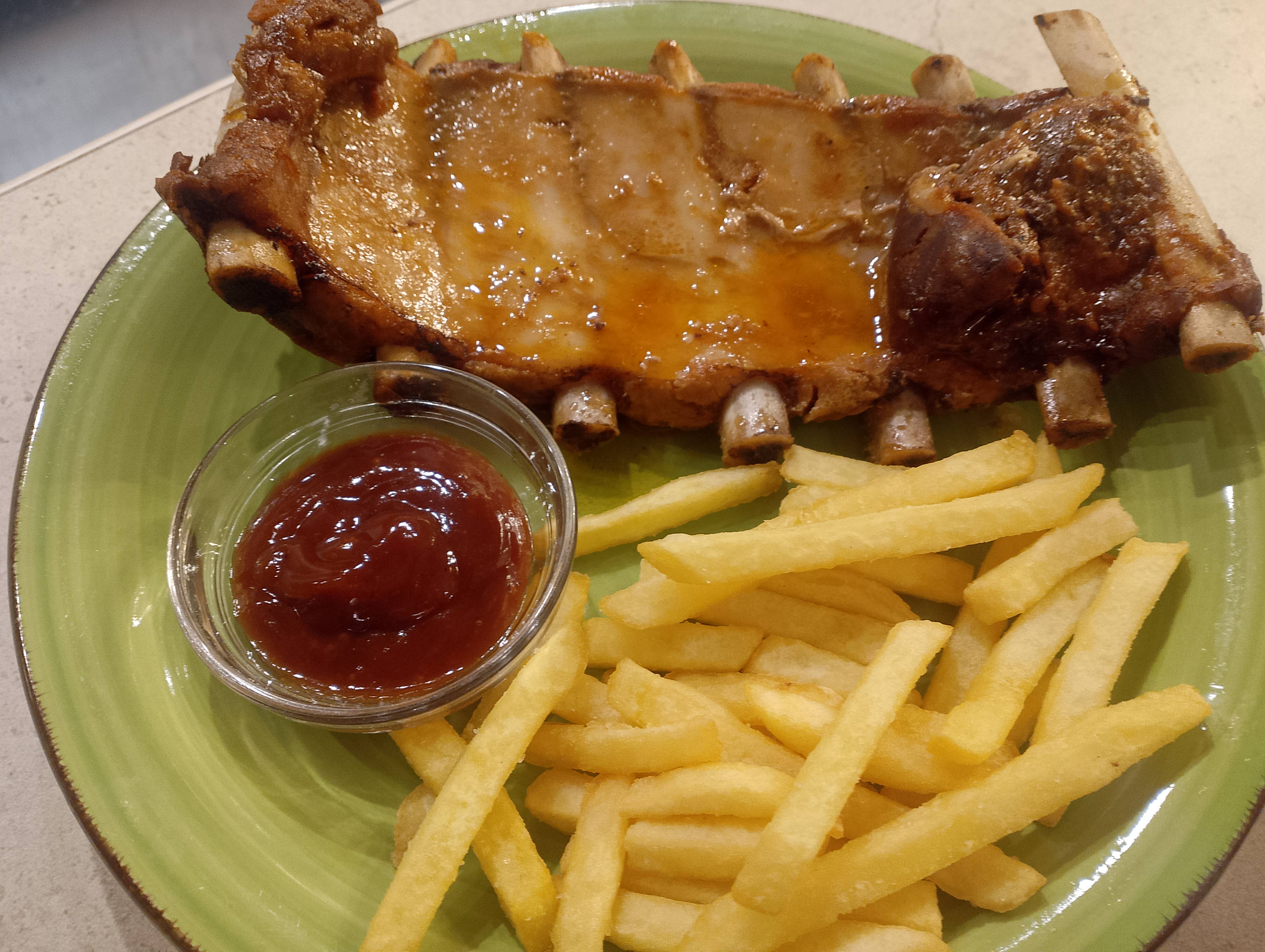 600gr Costine di maiale marinate e cbt con patate fritte e salsa bbq.